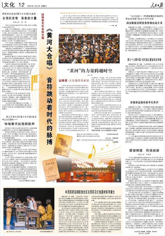 6月30日晚,北京音樂廳內(nèi),京津冀藝術(shù)家會聚一堂,奏響交響音樂會《黃河》;不久前,廣東深圳8個合唱團、300余名歌者共同演唱《黃河大合唱》,吸引近120萬網(wǎng)友線上觀演……80多年來,從烽火硝煙中誕生的《黃河大合唱》成為跨越時空的回響,承載著中華兒女的共同記憶。從主題展覽到各類演出,《黃河大合唱》的每個音符都跳動著時代的脈搏,讓我們重溫這首抗戰(zhàn)歌曲,感受經(jīng)典作品傳承的永恒力量。