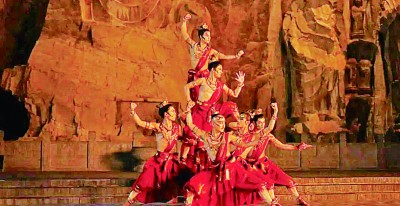 從中華優(yōu)秀傳統(tǒng)文化中尋找藝術(shù)基因和創(chuàng)作靈感的文藝佳作不斷涌現(xiàn),一部部舞臺(tái)表演藝術(shù)作品“破圈”而來(lái),精彩紛呈。河南衛(wèi)視2021年七夕節(jié)制作的《七夕奇妙游》中以龍門石窟石刻圖像飛天和金剛為素材編創(chuàng)的實(shí)景舞蹈《龍門金剛》,就是其中的杰作之一。懷抱樂(lè)器的伎樂(lè)天從洞窟中飛出,在大佛的注視下翩翩起舞,金剛力士形象逼真、栩栩如生。藝術(shù)家賦予傳統(tǒng)文化遺存跨越歷史的藝術(shù)魅力。古風(fēng)豫韻舞蹈藝術(shù)與龍門石窟悠久的歷史文化相得益彰,將“文化+旅游”的精髓和深意作了深刻的演繹和闡釋。