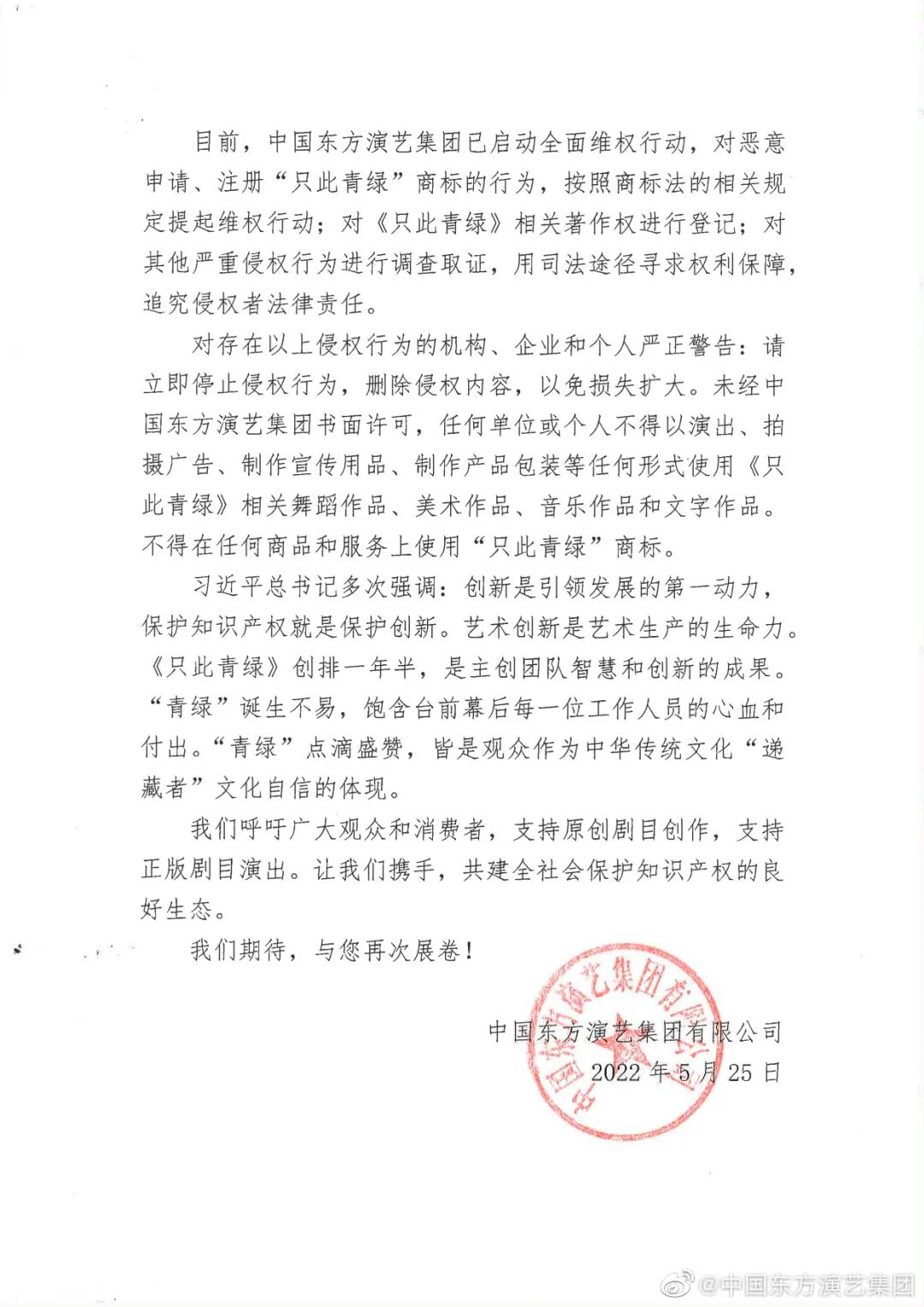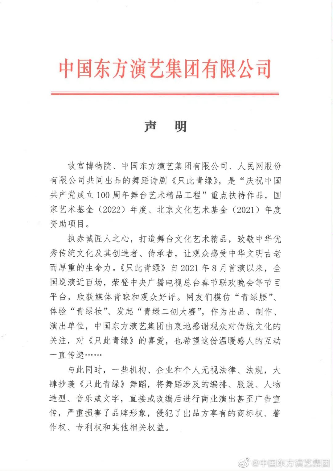 作為舞蹈詩劇《只此青綠》出品方之一,中國東方演藝集團(tuán)25日發(fā)表聲明,已啟動對《只此青綠》的全面維權(quán)行動。