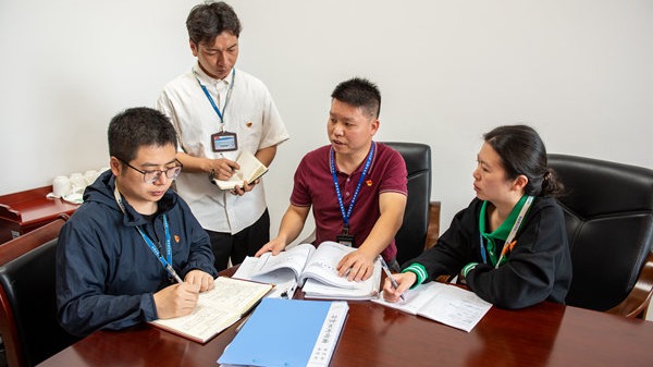 圖為唐玉軍(右二)正在與同事們一起研判問題線索。張津 攝