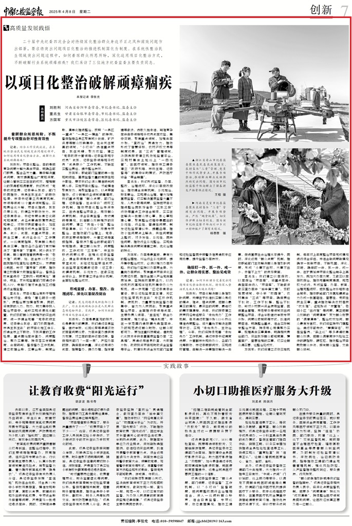 二十屆中央紀(jì)委四次全會(huì)對(duì)持續(xù)深化整治群眾身邊不正之風(fēng)和腐敗問題作出部署,要求將突出問題項(xiàng)目化整治的推進(jìn)機(jī)制固化為制度。在系統(tǒng)性整治民生領(lǐng)域突出問題過程中,如何著眼群眾所思所盼,深化運(yùn)用項(xiàng)目化整治方式,不斷破解行業(yè)系統(tǒng)頑瘴痼疾?我們采訪了三位地方紀(jì)委監(jiān)委主要負(fù)責(zé)同志。