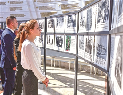 定格共同的勝利,重溫跨越時(shí)空的二戰(zhàn)記憶。“銘記歷史 開創(chuàng)未來(lái)”——紀(jì)念中國(guó)人民抗日戰(zhàn)爭(zhēng)暨世界反法西斯戰(zhàn)爭(zhēng)勝利80周年圖片展正在白俄羅斯國(guó)立偉大衛(wèi)國(guó)戰(zhàn)爭(zhēng)歷史博物館展出。圖為觀眾在參觀展覽。新華社記者 張超群 攝