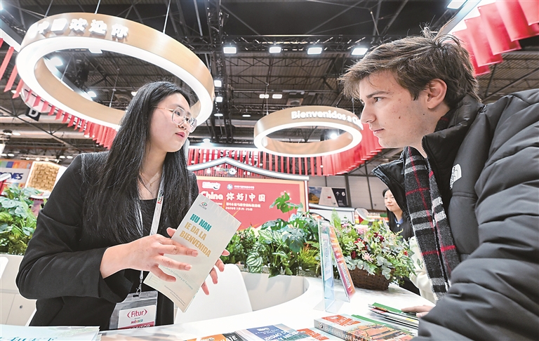近年來,過境免簽政策持續(xù)擴容、免稅購物政策不斷優(yōu)化、“即買即退”適用商店持續(xù)增加……得益于中國日益開放的舉措,越來越多外國游客在中國旅游、購物,感受更加開放包容、多元創(chuàng)新的中國。圖為1月21日至25日舉行的馬德里國際旅游展上,參觀者在中國展臺咨詢。新華社記者 程敏 攝