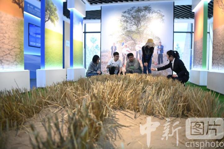 4月16日,甘肅省武威市古浪縣,學(xué)生們在八步沙兩山實踐創(chuàng)新基地參觀了解當(dāng)?shù)靥禺a(chǎn)。