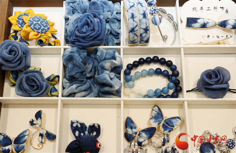 染好的布匹還要經(jīng)過(guò)脫漿、清洗、陰干,最后才是拆線、整理。當(dāng)一塊完整的藍(lán)印花布展現(xiàn)在眼前時(shí),李梅總會(huì)輕輕撫摸布料,仿佛在與草木對(duì)話。她的工作室里,掛滿了用藍(lán)染制成的物件:桌布上印著成片的板藍(lán)根葉,茶席邊緣綴著小巧的藍(lán)染布扣,就連她日常穿的棉麻衫,也是自己染的淡藍(lán)色。“這些布不是冰冷的商品,是帶著土地溫度的生活。”李梅說(shuō),去年她在平?jīng)龉懦情_了一間“藍(lán)染生活館”,游客可以跟著她學(xué)種板藍(lán)根、體驗(yàn)扎染,很多人第一次發(fā)現(xiàn),原來(lái)衣服上的藍(lán)色可以來(lái)自田野,非遺技藝能如此貼近日常。