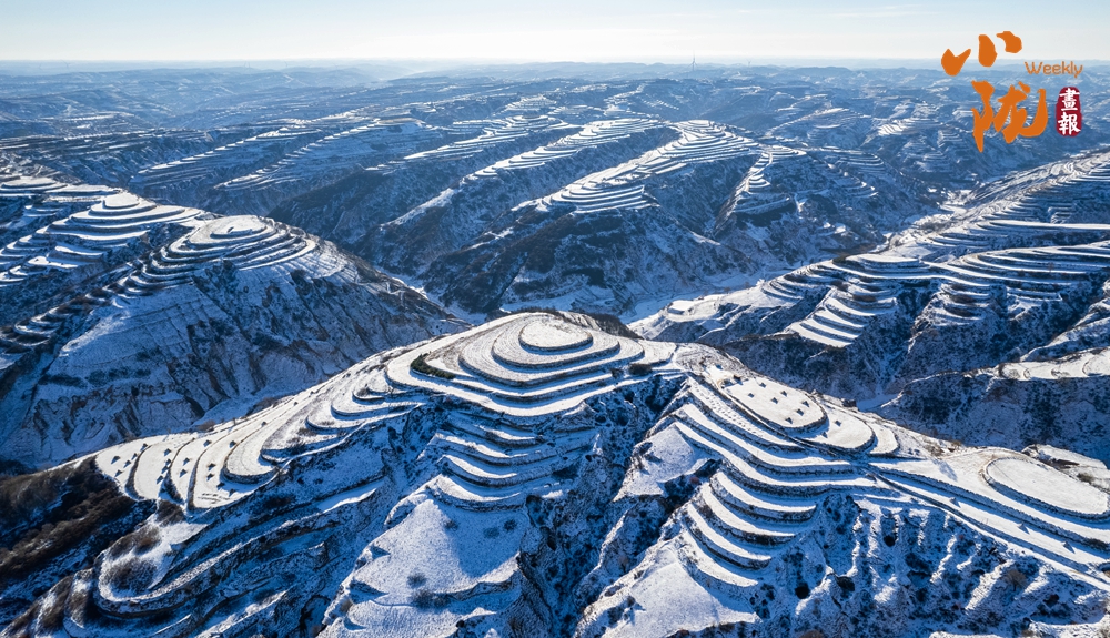 梯田坎沿的積雪輕柔如絮,堆疊出圓潤起伏的曲線,一層疊一層,一卷連一卷,仿佛凝固的浪濤,靜默書寫著這片紅色土地抗?fàn)幉幌?、?jiān)韌生長的歷史記憶。