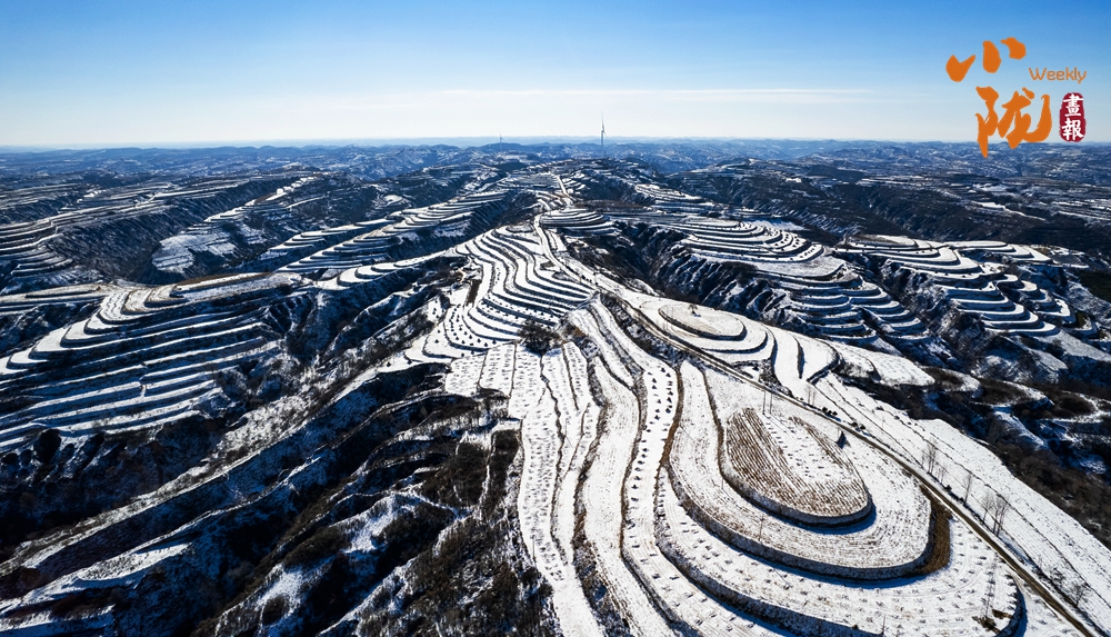 雪后,黃土塬深深的溝壑梁峁被鍍上薄薄的金暉。積雪以統(tǒng)一的筆觸,將起伏的地貌融成連綿的銀色波浪,于藍(lán)色的天幕下舒展著,如同大地默誦的一首長詩。