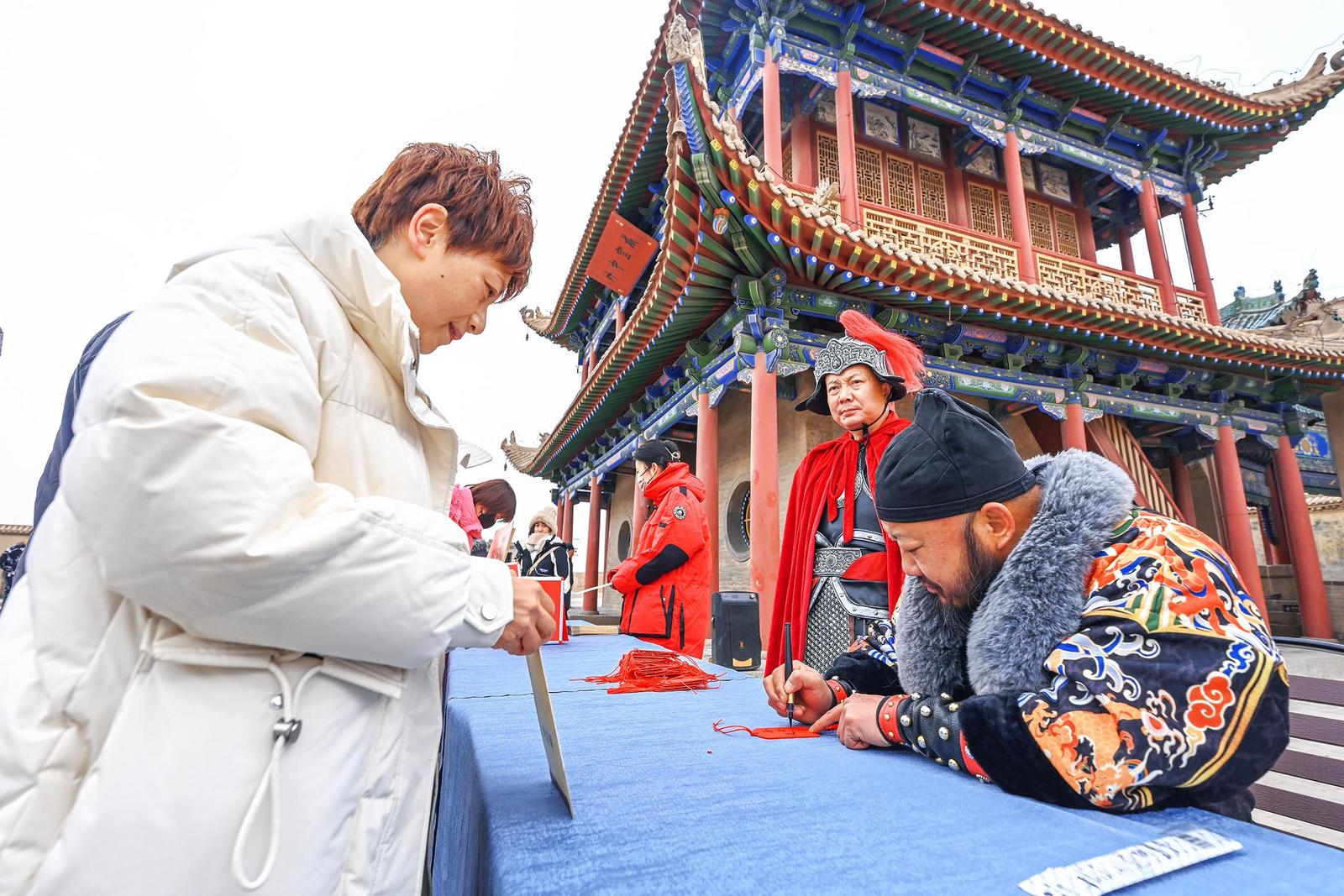 “關(guān)長”為游客現(xiàn)場書寫“福”牌。
