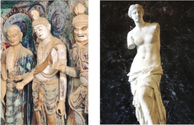 可是,“脅侍菩薩微笑著,在她低垂的眼中可能根本沒有勝負這回事。這種眼神是利他而非個人的……當我們在45窟佛龕前微微俯下身子之時,溫暖的奇跡出現(xiàn)了,她正慈祥地看著你。一位是由堅硬的大理石所雕,另一位是由敦煌本地黏土所塑,維納斯和脅侍菩薩似乎代表了兩種生活態(tài)度。假如她們在盧浮宮中相遇,談論起美。維納斯可能會唱起女詩人薩福的詩歌:‘你愛的就是美的。這容易解釋。’脅侍菩薩則依然保持微笑,靜靜地看著維納斯”。