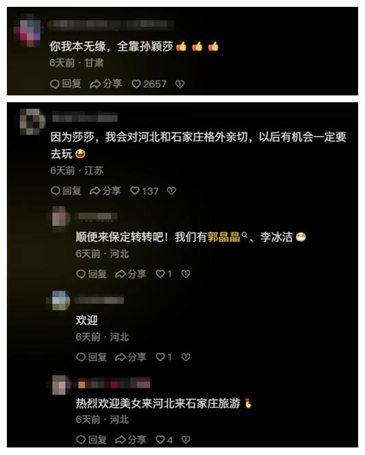 此前,多位網(wǎng)友向石家莊市文化廣電和旅游局官方賬號(hào)“石家莊文旅之聲”留言,表示想看國(guó)乒名將孫穎莎代言家鄉(xiāng)。公開資料顯示,出生于河北省石家莊市的孫穎莎在此開啟了乒乓球生涯。
