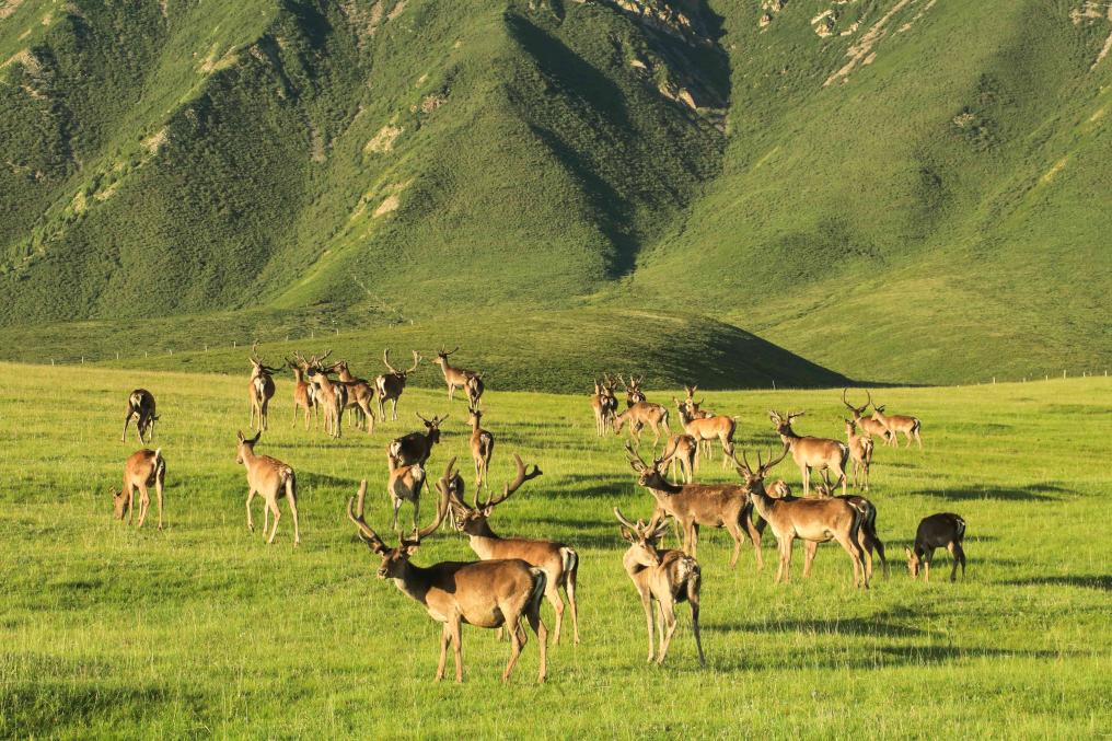 這是在甘肅省張掖市肅南裕固族自治縣拍攝的高山草甸之間的肅南馬鹿。新華社發(fā)(肅南縣委宣傳部供圖)