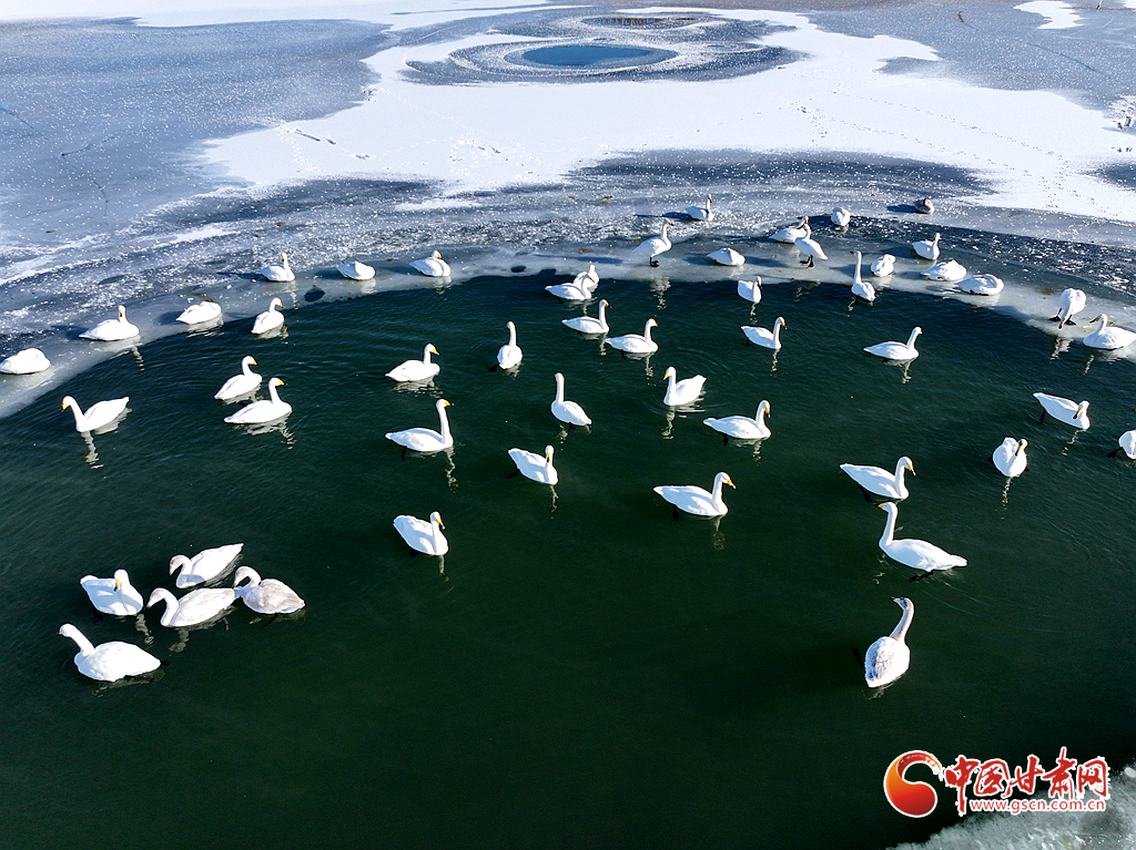 近日,在甘肅省張掖國家濕地公園,成群的越冬天鵝在冰封的湖面上悠然覓食、嬉戲,構成了一幅動人的生態(tài)畫卷,成為冬日里一道尤為引人注目的風景線。