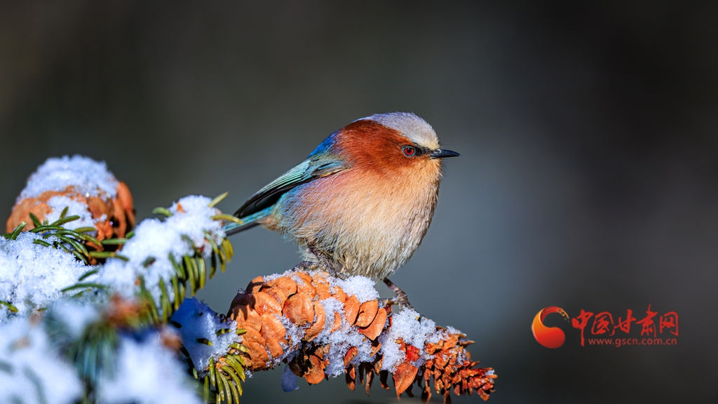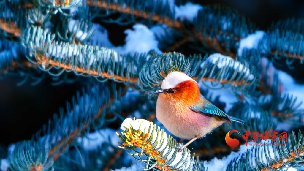 這群被譽(yù)為“祁連山精靈”的小鳥,頭頂雪白羽冠蓬松如絨,仿佛戴上了一頂天然的小絨帽,棕紅面頰溫潤(rùn)似玉,在陽光下泛著柔和的光澤,藍(lán)綠背羽如同上好的寶石,在雪色映襯下泛著金屬般的質(zhì)感。淡粉與橙白相間的腹羽柔和雅致,層次分明,在純白背景的映襯下,形成強(qiáng)烈而和諧的視覺碰撞,它們或亭亭立于覆雪松枝,或靈巧穿梭于松針間隙,更有靈動(dòng)的個(gè)體俯身探喙,啄取松針縫隙里的昆蟲,一聲輕脆的啄擊,劃破林間的清寂,卻更顯山野幽靜,羽翼輕振間,將“雪中覓食”的鮮活圖景永久定格。